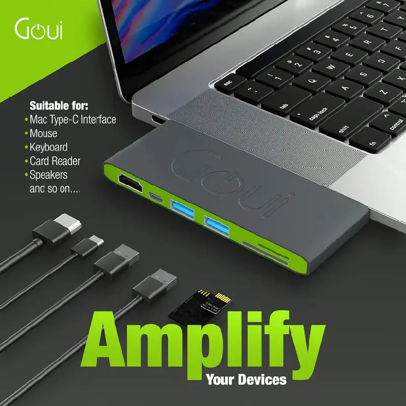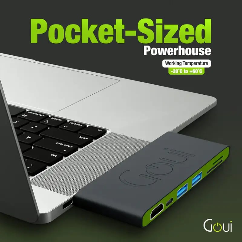 L’adaptateur USB-C Goui HUBI pour MacBook est la solution idéale pour étendre facilement la connectivité de votre ordinateur portable Apple. En effet, grâce à ses multiples ports, il vous permet de connecter simultanément des périphériques essentiels : HDMI, USB, SD, microSD et USB-C.